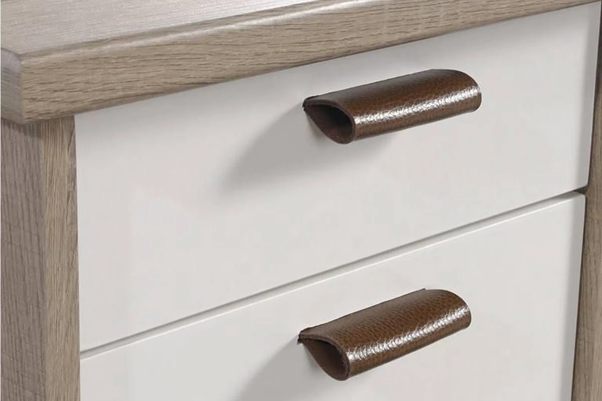 The drawer fronts also feature an unusual yet stunning addition of drawer pulls in durable brown leather for an extra touch of class.