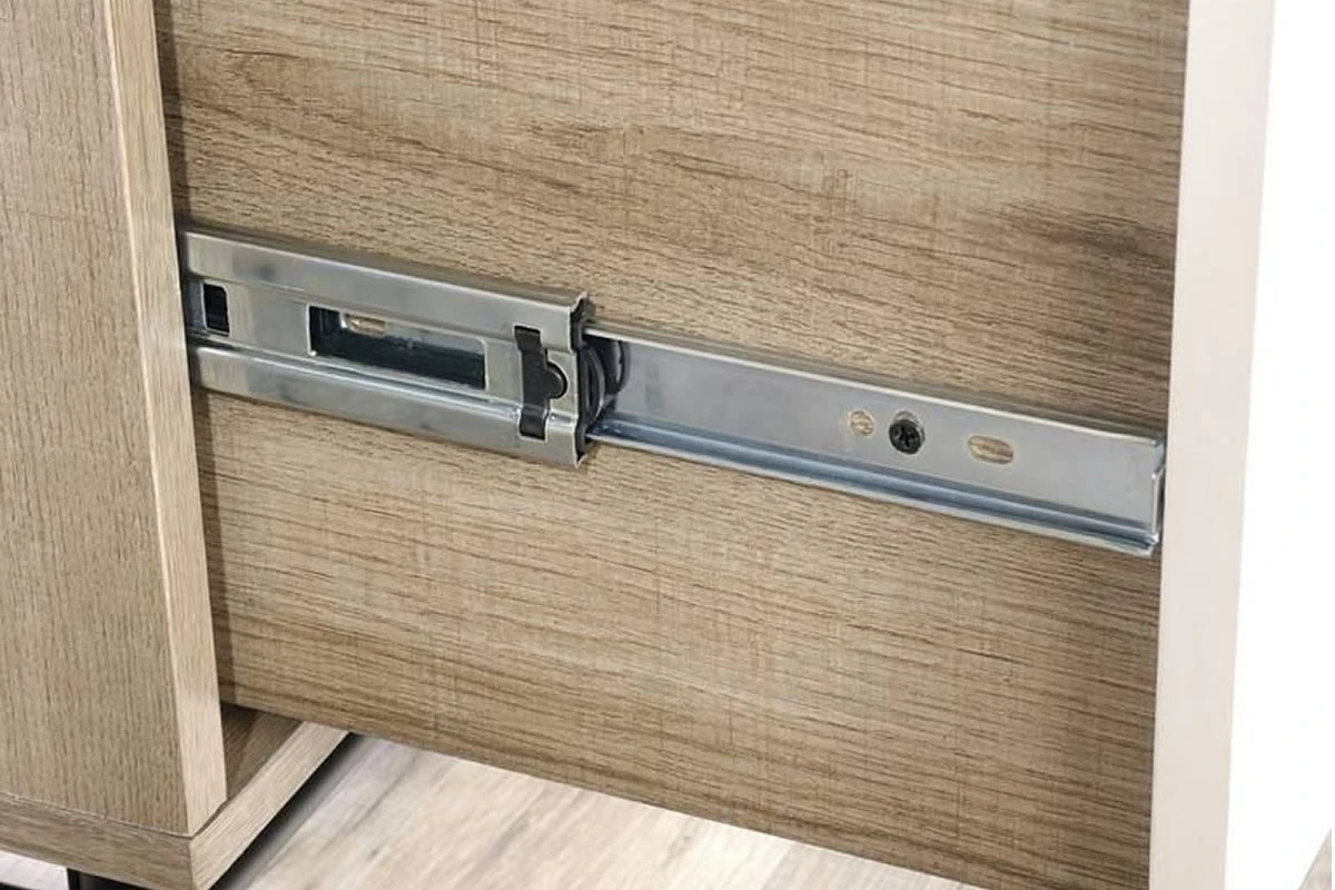 It also includes two file drawers with full extension slides for holding letter-size hanging files and four storage drawers featuring metal runners with safety stops in a beautifully contrasting white accent.