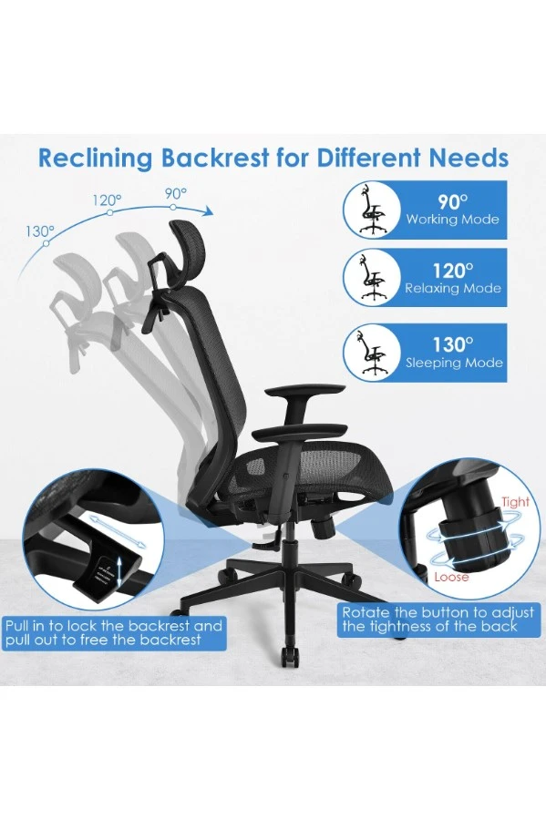 You can adjust the backrest angle to suit your preference, from a straight 90° to a relaxed 130° angle. You can also release the backrest lock, allowing the backrest to rock freely.