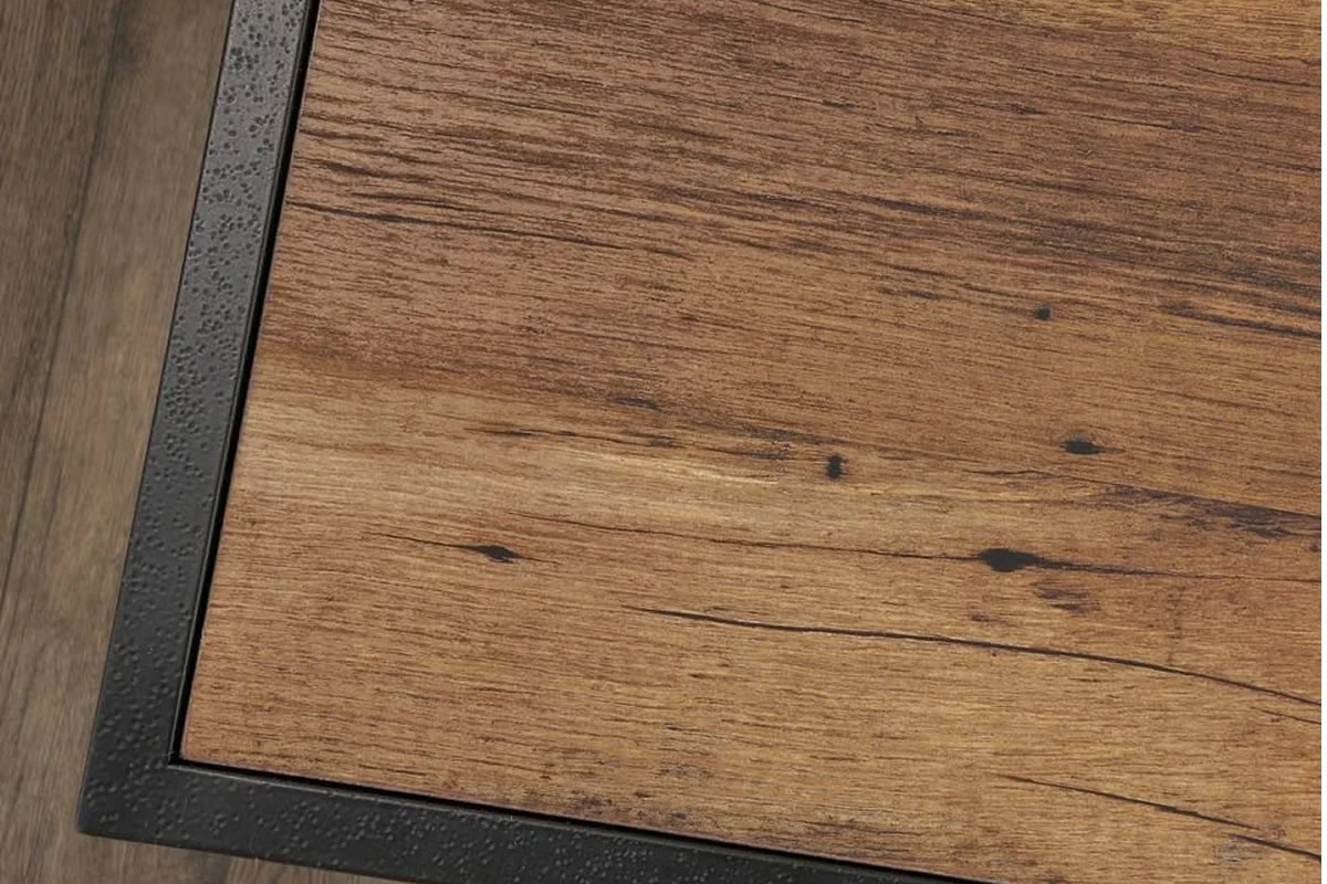 - Contemporary home office L-shaped desk in Vintage Oak finish and modern black accents