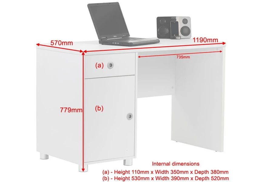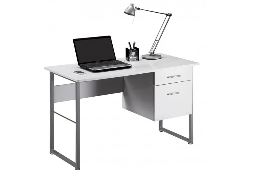 The Cabrini is a modern desk made from beautiful white painted wood with a complementing grey frame. Its sturdy design includes a floating pedestal featuring stationery and filing drawers,