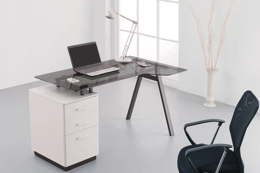 The toughened glass has been cut into an L shape to maximise work space, whilst the beautiful pedestal contains 2 stationery drawers and a filing drawer, all finished with matching chrome handles.