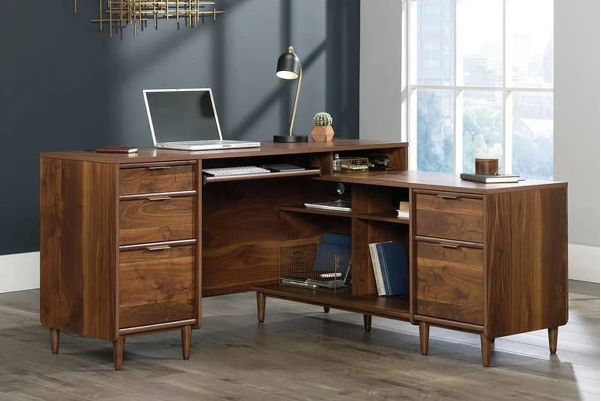 - Beautifully appointed L-shaped desk in Grand Walnut effect finish