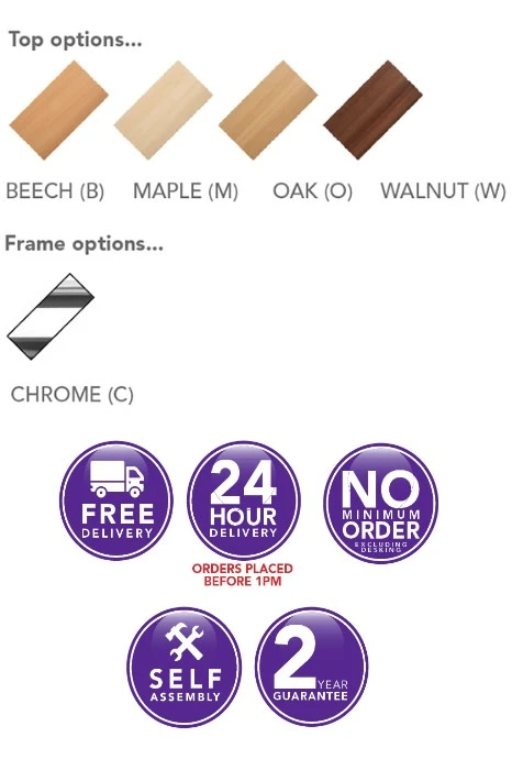 The solid 25mm top is both heat and scratch resistant and has a tough 2.5mm impact resistant ABS edge all the way round. Mounted onto a 16 gauge strong steel frame with chrome leg and strong heavy duty adjustable feet.