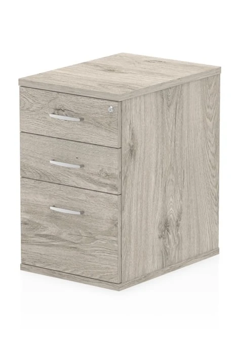 Do you need a desk that can keep your files and documents organized and secure? If so, you will love the Gladstone 3 drawer desk high pedestal in grey oak. This pedestal is not only a practical storage solution, but also a stylish addition to your workspace. It has three drawers that can be locked with one key, so you can protect your confidential and important papers. The top drawer is perfect for storing your stationery and accessories, while the middle drawer can fit either foolscap or A4 suspension files. The bottom drawer is a filing drawer that can hold up to 25 kg of files. The drawers are smooth and easy to open, thanks to the metal drawer runners and handles. The pedestal is made of durable MFC board that is wipeable and scratch-resistant. It has a grey oak finish that matches any decor and gives a professional look. The pedestal also has levelling feet that can adjust to uneven floors. The Gladstone 3 drawer grey oak pedestal is designed to fit under your Gladstone desk, so you can save space and have everything within reach.