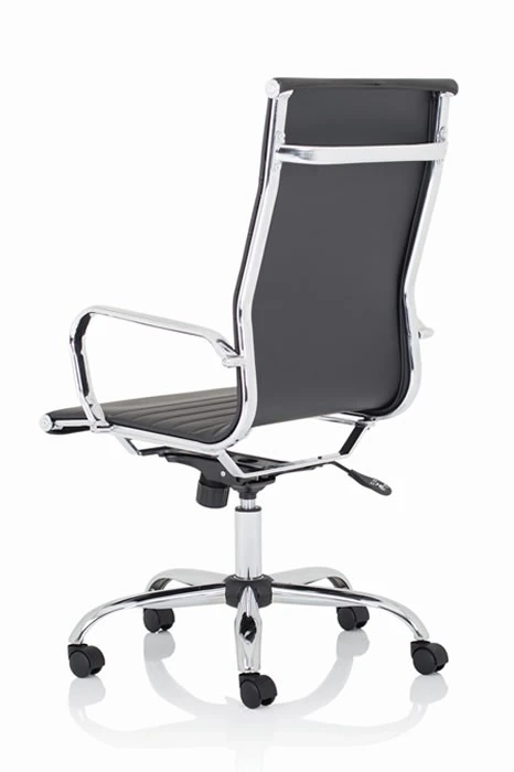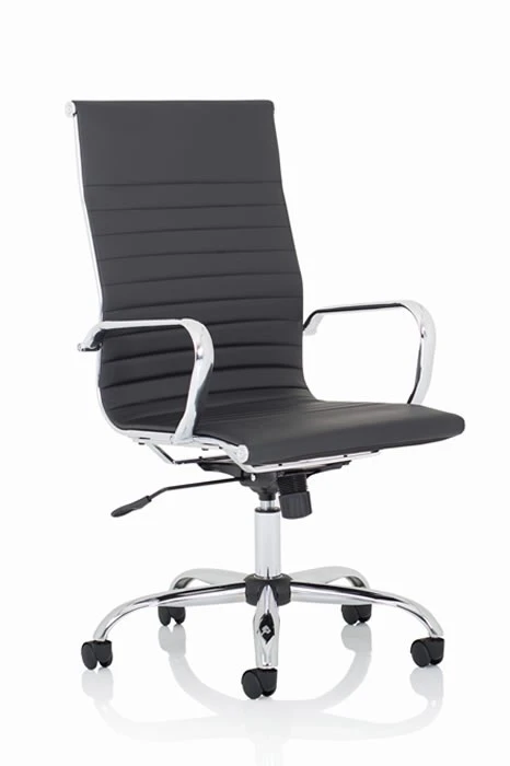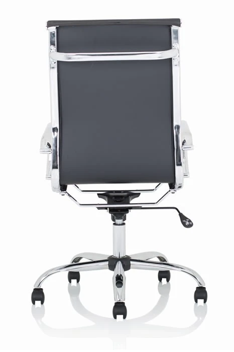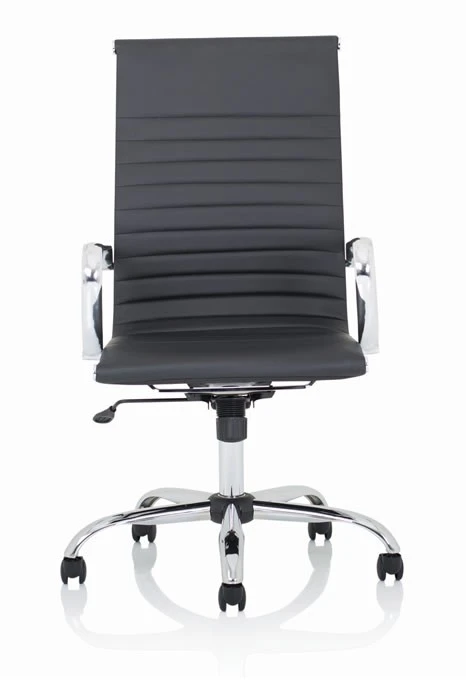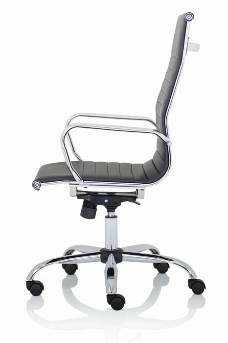 The Hiero designer office chair with its soft supple bonded leather and deeply padded seat and back gives excellent comfort. The bright chrome armrests give this chair a classic designer look.
