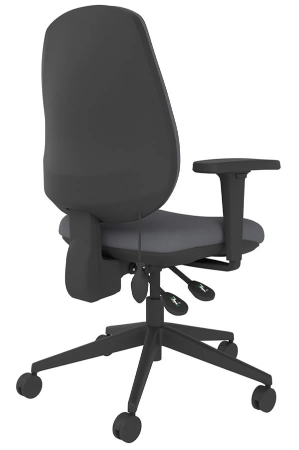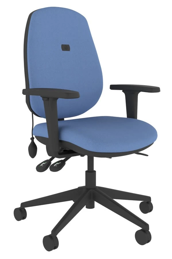 High back operator chair with 3 lever mechanism. The seat can be adjusted to angle tilt and slide forward to increase leg depth. Seat height adjustment and independent backrest adjustment and recline that can be locked in any position.