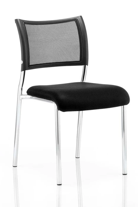 Steel tubed stacking chair with upholstered seat and mesh backrest. Stacks approximately 4 chairs high.