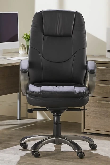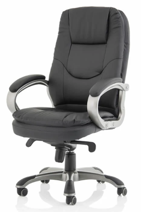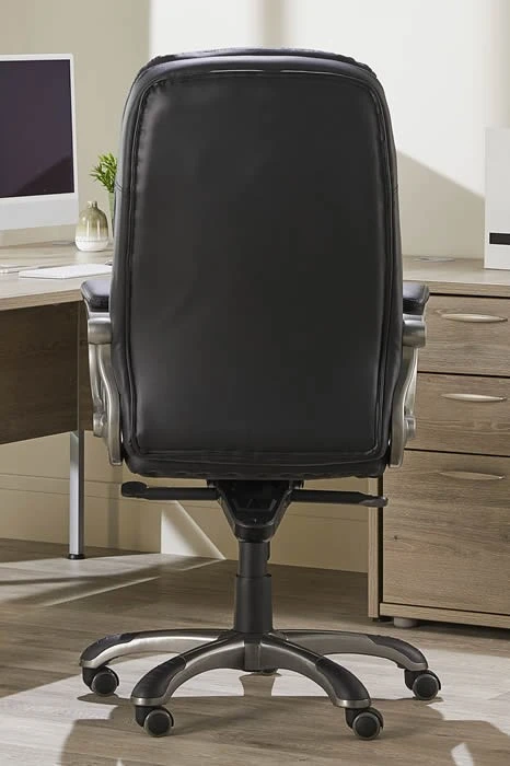 The black leather is complemented perfectly with a gunmetal grey finished frame, along with padded armrests for additional comfort. The chair is then supported on a robust five-star base, while the castors allow the chair to glide effortlessly across any surface.