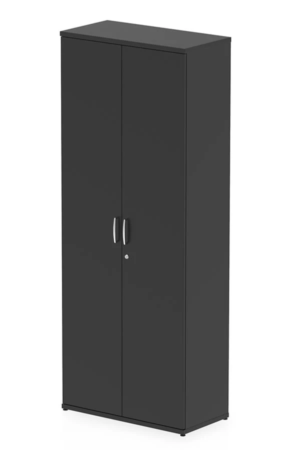 The Optima Black cupboard with full-length doors is available in a black wood finish. Featuring scratch-resistant surfaces, the cupboards are a durable storage solution for any environment.