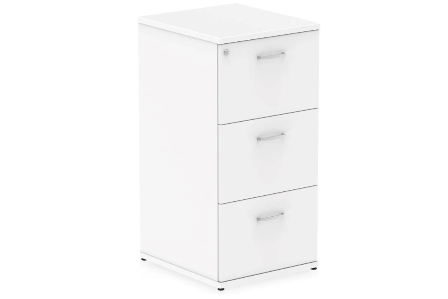 Keep your files organized and secure with this Polar White 3-drawer filing cabinet in a white finish. This cabinet has three spacious drawers that can fit both foolscap and A4 files. You can lock the drawers with a key and keep your documents safe and confidential.