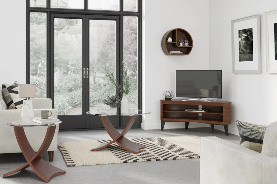 The Siena Lamp Table features a clear toughened glass top with a bevelled edge that reflects light and creates a spacious feel. The glass top rests on sleek veneered legs that curve gracefully to the floor. The legs are available in three different colours: grey, oak or walnut, so you can choose the one that matches your style and décor.