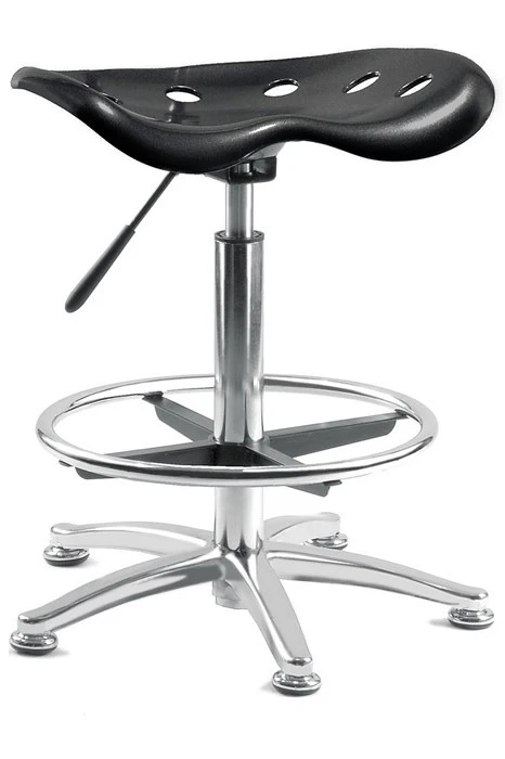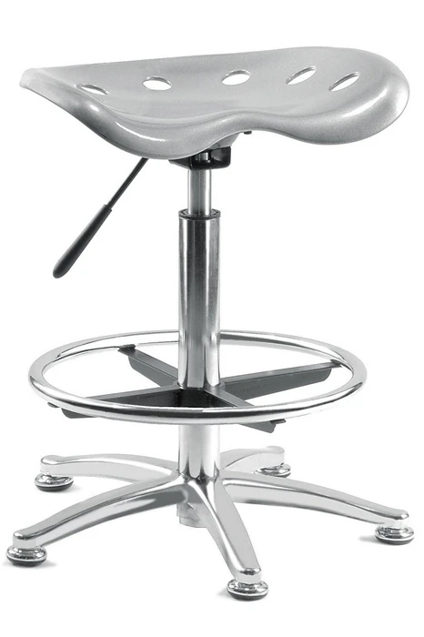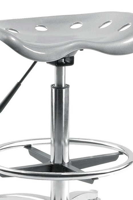 Contemporary high-tek poly draughting chair with silver seat. Features a chrome gas seat height adjustment and fixed chrome foot ring.